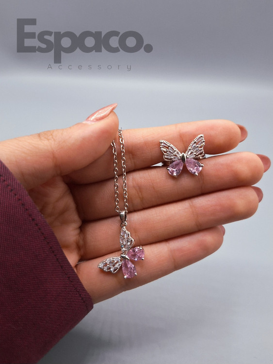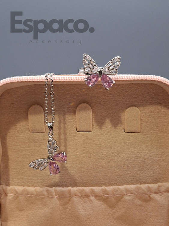 ست گردنبند و انگشتر جواهری پروانه صورتی💕