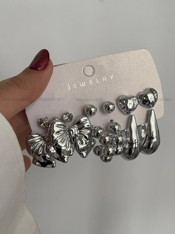 شامل: گوشواره پاپیون بزرگ، گوشواره اشکی، گوشواره کریستال، گوشواره توپی نقره ای و گوشواره حلقه ای توپی